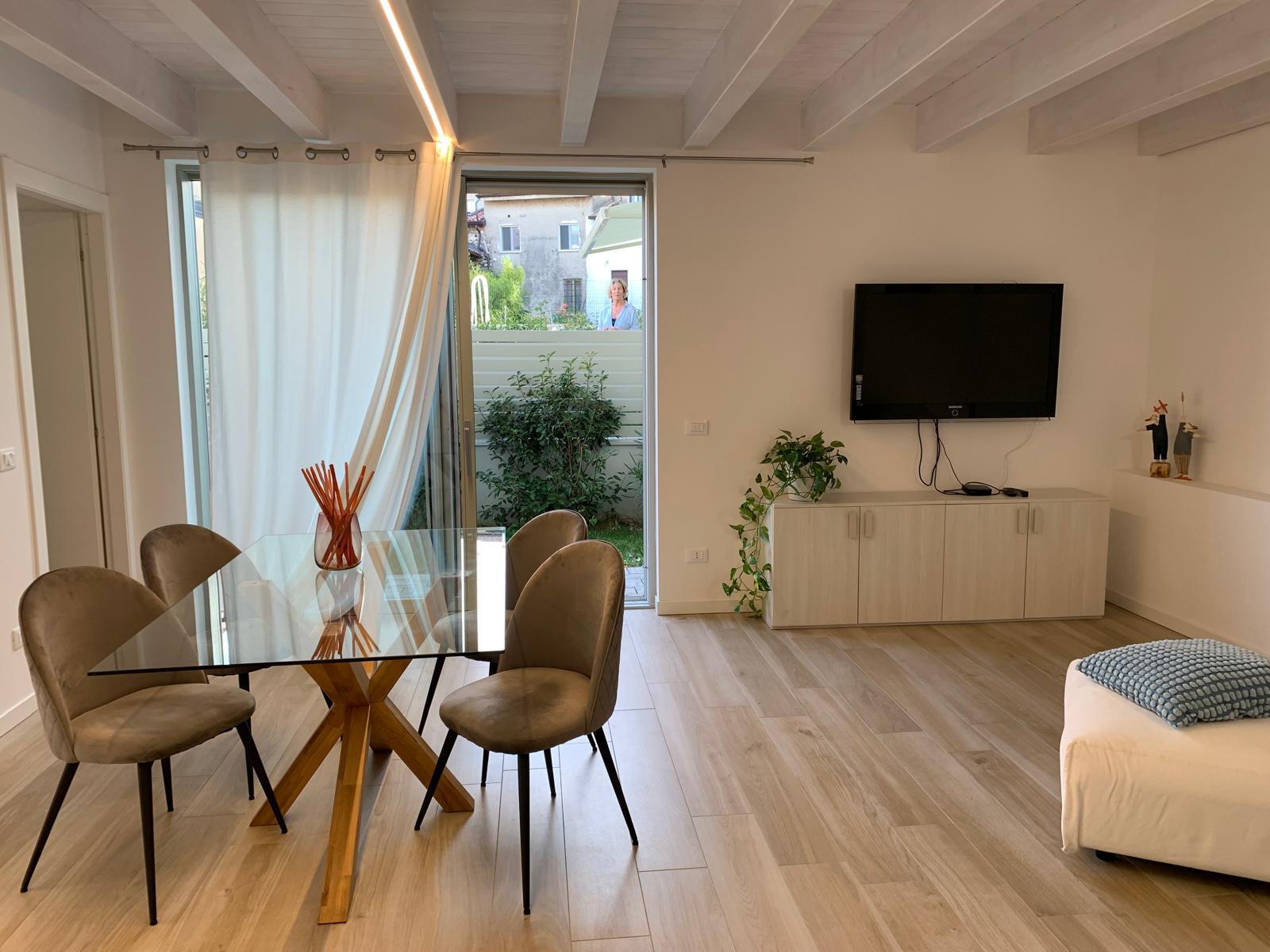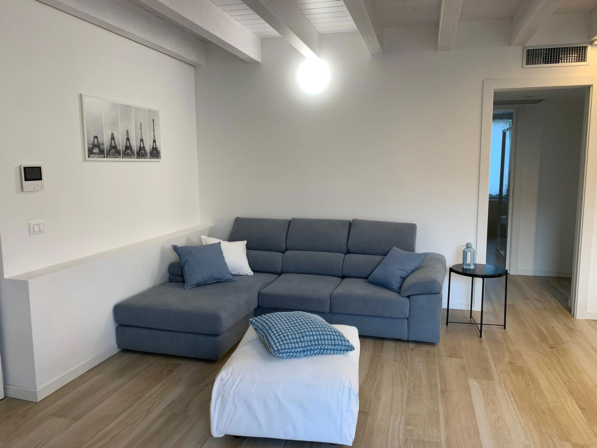 All’interno vi accoglie un ampio e luminoso soggiorno moderno, arredato con cura e dotato di comodo divano e Smart TV a schermo piatto. La zona living è pensata per offrire spazio, luce e comfort in ogni momento della giornata.