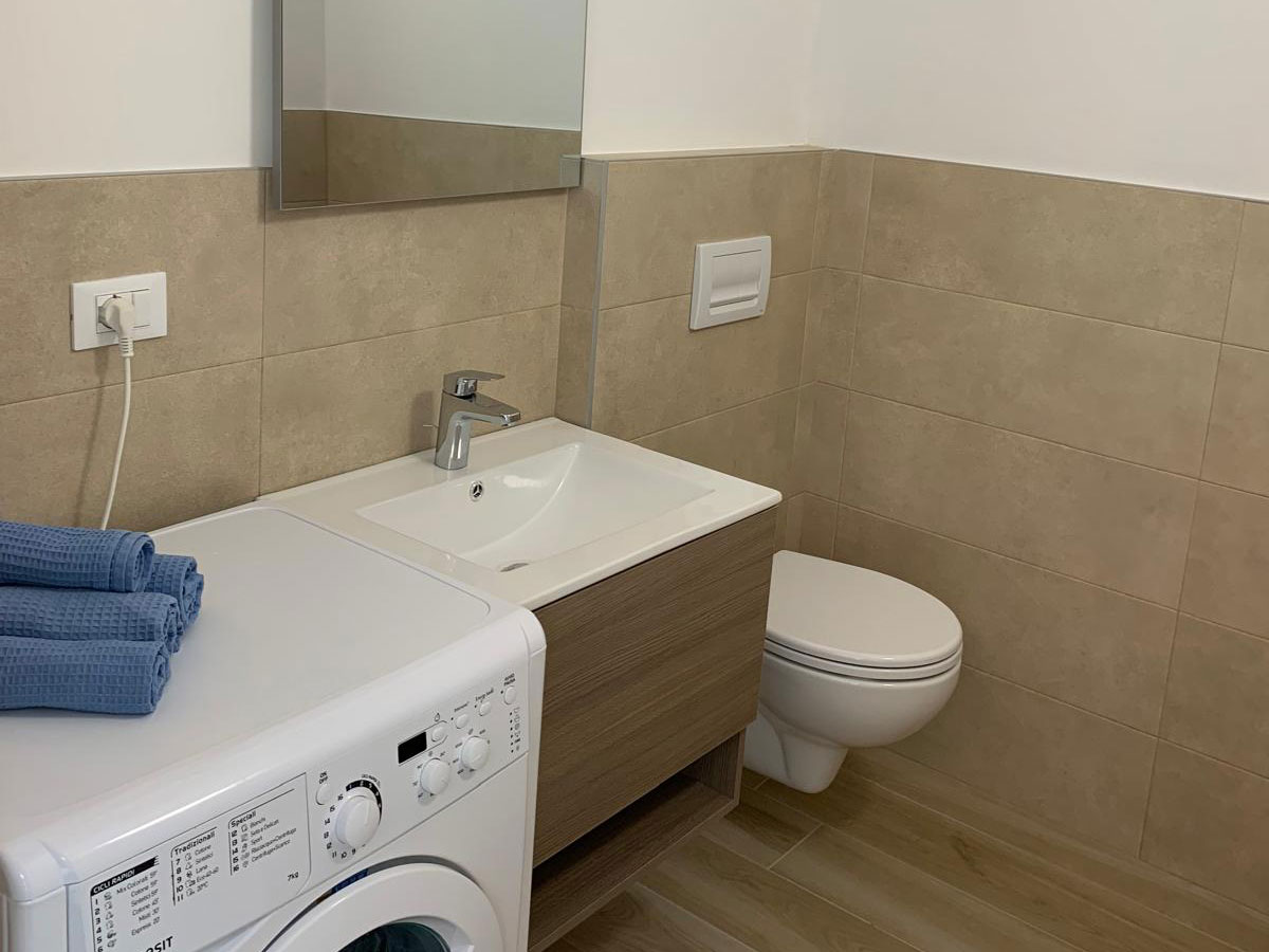 Un bagno di servizio con lavandino, WC e una comoda lavatrice