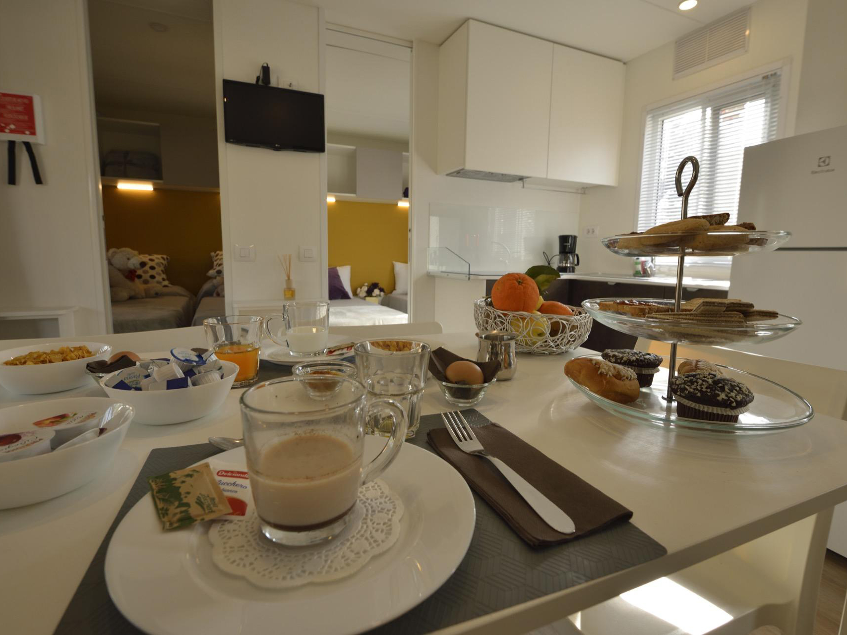 Das Mobilheim FAMILY DOG kann bis zu 6 Personen beherbergen. Das Mobilheim mit einer Fläche von 30 m² bietet funktionalen und komfortablen Raum; die Unterkunft verfügt über ein Wohnzimmer mit Klimaanlage, Kochnische und Sofa, 1 Schlafzimmer mit Doppelbett, 2 Schlafzimmer mit je 2 Einzelbetten und 2 Badezimmer mit WC, Dusche und Waschbecken. Draußen gibt es eine überdachte Veranda (8 x 2,5 m) mit Tor. Ein Parkplatz ist inbegriffen. Maximal 2 Haustiere erlaubt.