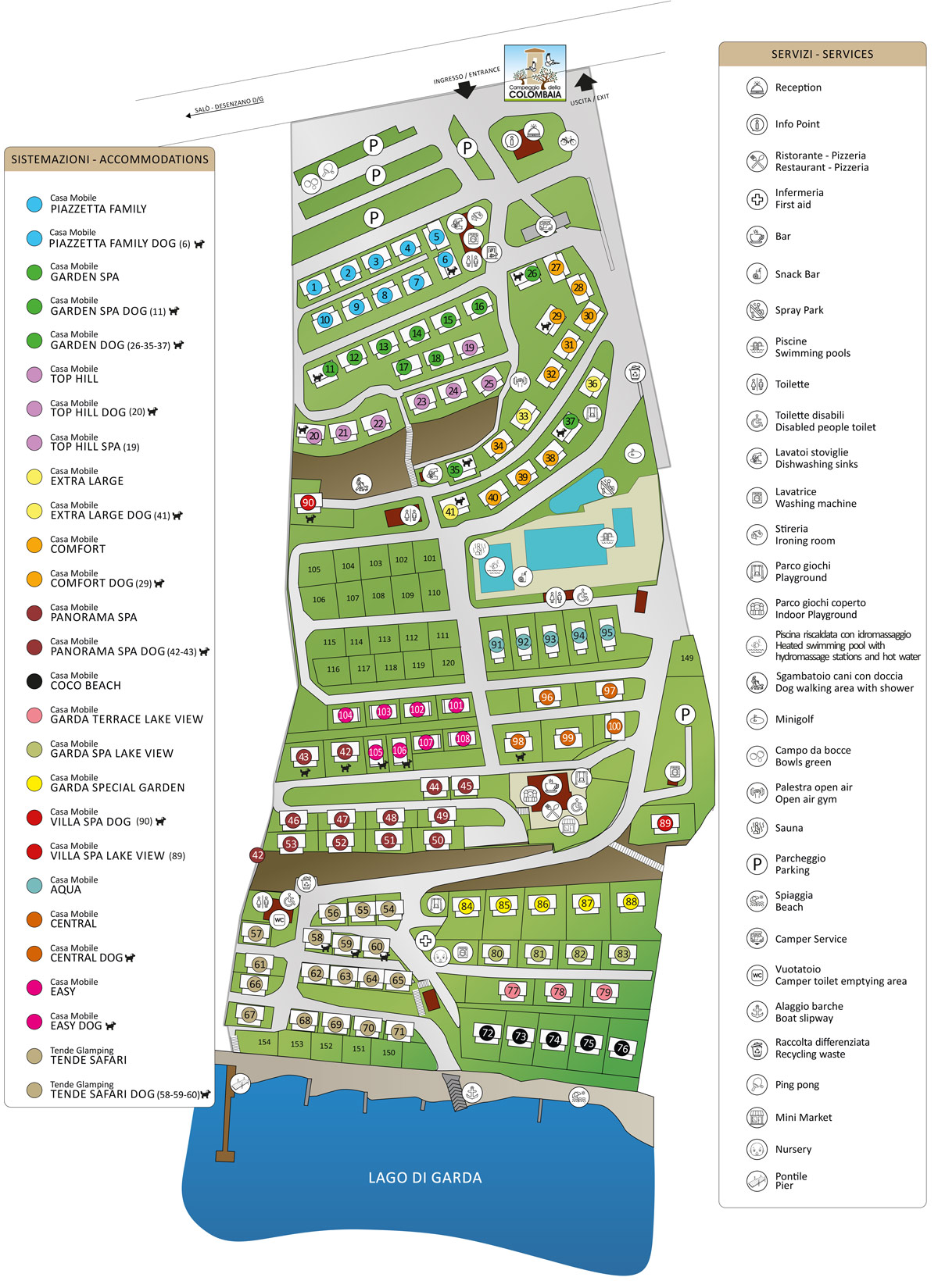 Sieh dir den Lageplan des Campingplatzes Colombaia an, um zu erfahren, wo sich die Unterkünfte befinden.
