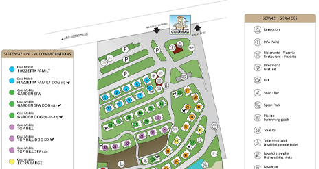 The GARDEN DOG mobile home can accommodate up to 5 people. The mobile home, with an area of 30 square meters, offers functional and comfortable spaces; the accommodation has a living room with air conditioning, kitchenette and sofa, 1 double bedroom, 1 bedroom with 3 single beds (one of which is a flag) and 1 bathroom with toilet, shower and sink. Outside a covered veranda (7.4 x 2.5 m). On the veranda there is a kennel for your dogs. One parking space included. Maximum 2 pets allowed.