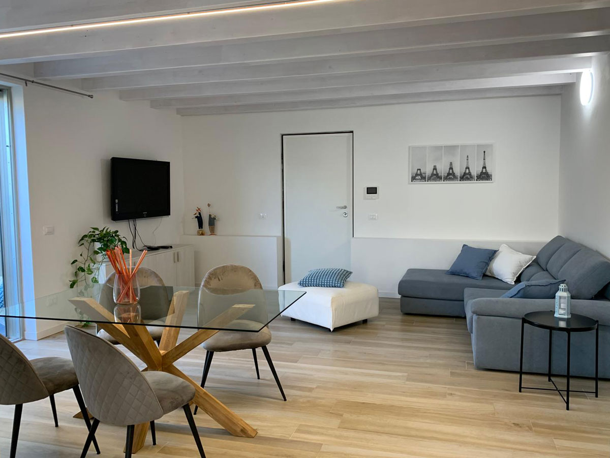 All’interno vi accoglie un ampio e luminoso soggiorno moderno, arredato con cura e dotato di comodo divano e Smart TV a schermo piatto. La zona living è pensata per offrire spazio, luce e comfort in ogni momento della giornata.