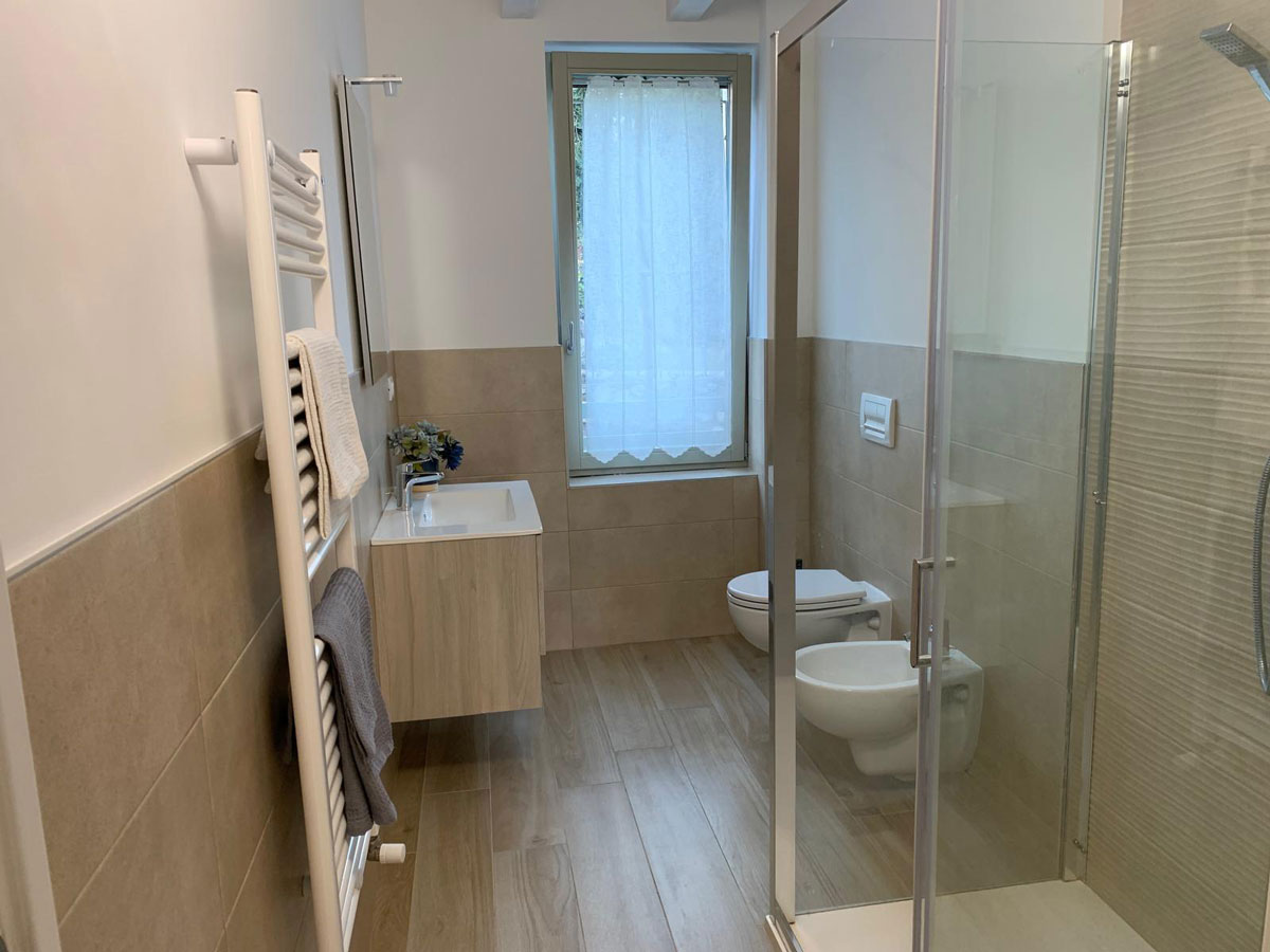 Un bagno principale con box doccia, lavandino, WC e bidet